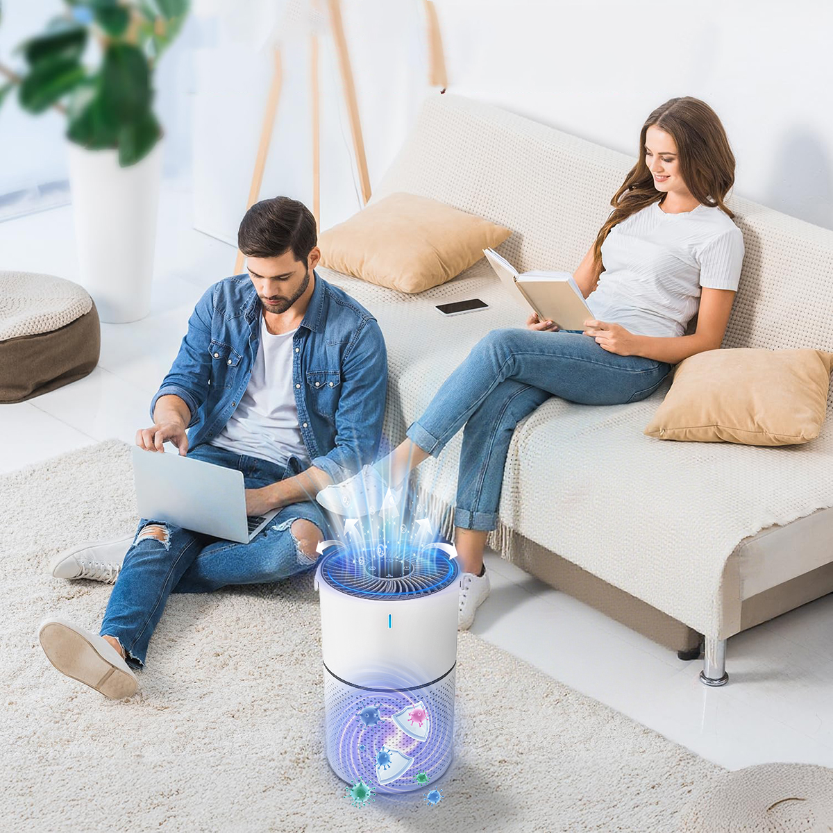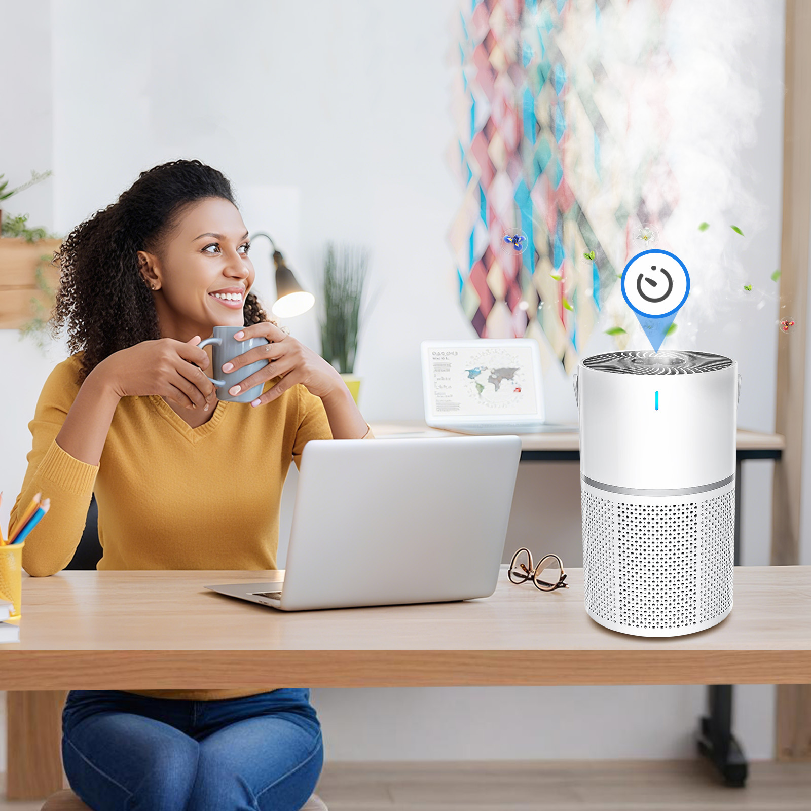 - 360° allsidig rensing: Luftinntaksdesignet sikrer grundig og fullstendig rensing av luften i rommet.