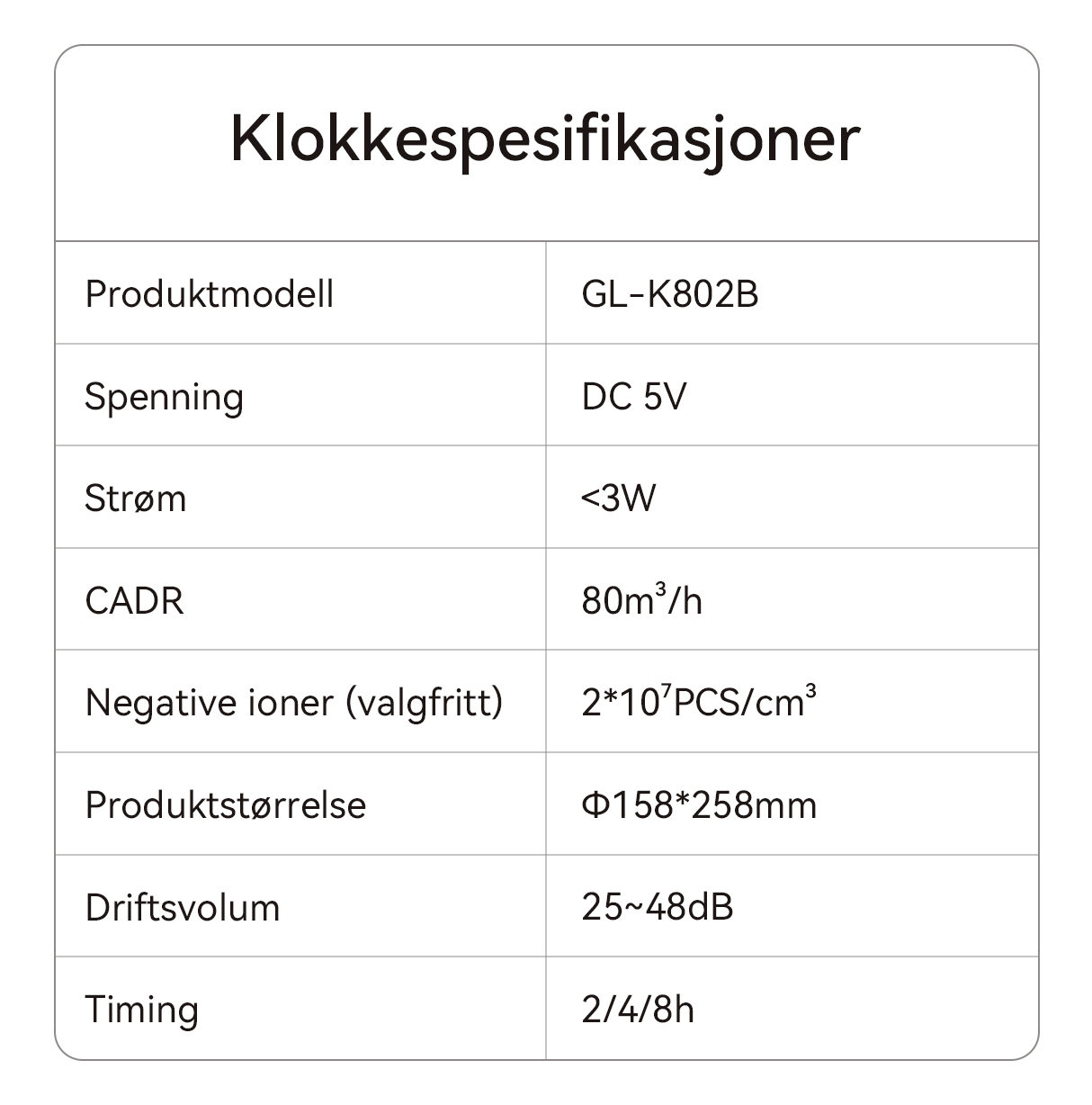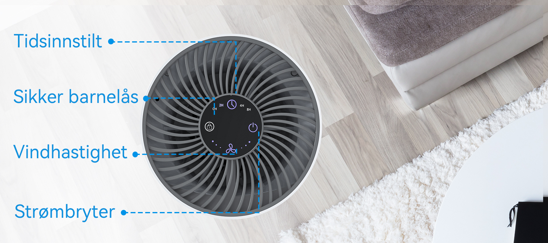 - Smarte og praktiske kontroller: Enkelt justerbare viftehastigheter og en timer gjør bruken enkel.